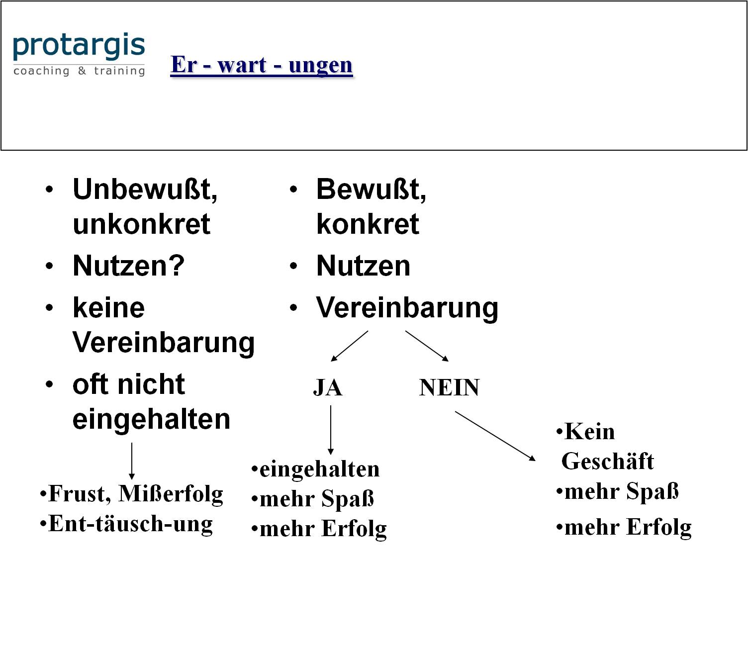 Wir sollten damit beginnen, uns unsere Erwartungen an andere bewusst machen und konkretisieren – und uns auch überlegen, was wir bereit sind zu investieren, damit diese Erwartungen erfüllt werden. Das sollte in jeder Partnerschaft und bei länger andauernden Aktivitäten geschehen, gleich oder es um die Erwartungen des Vorgesetzten sowie Mitarbeiters an die Arbeitsbeziehung, des Beraters sowie des Kunden an eine Zusammenarbeit oder die Erwartungen von Paaren an das Zusammenleben betrifft. Ein Gespräch über unsere Erwartungen an gemeinsame Aktivitäten können wir auch mit unseren Freunden, Vereinskameraden, Handwerkern oder Ärzten führen.