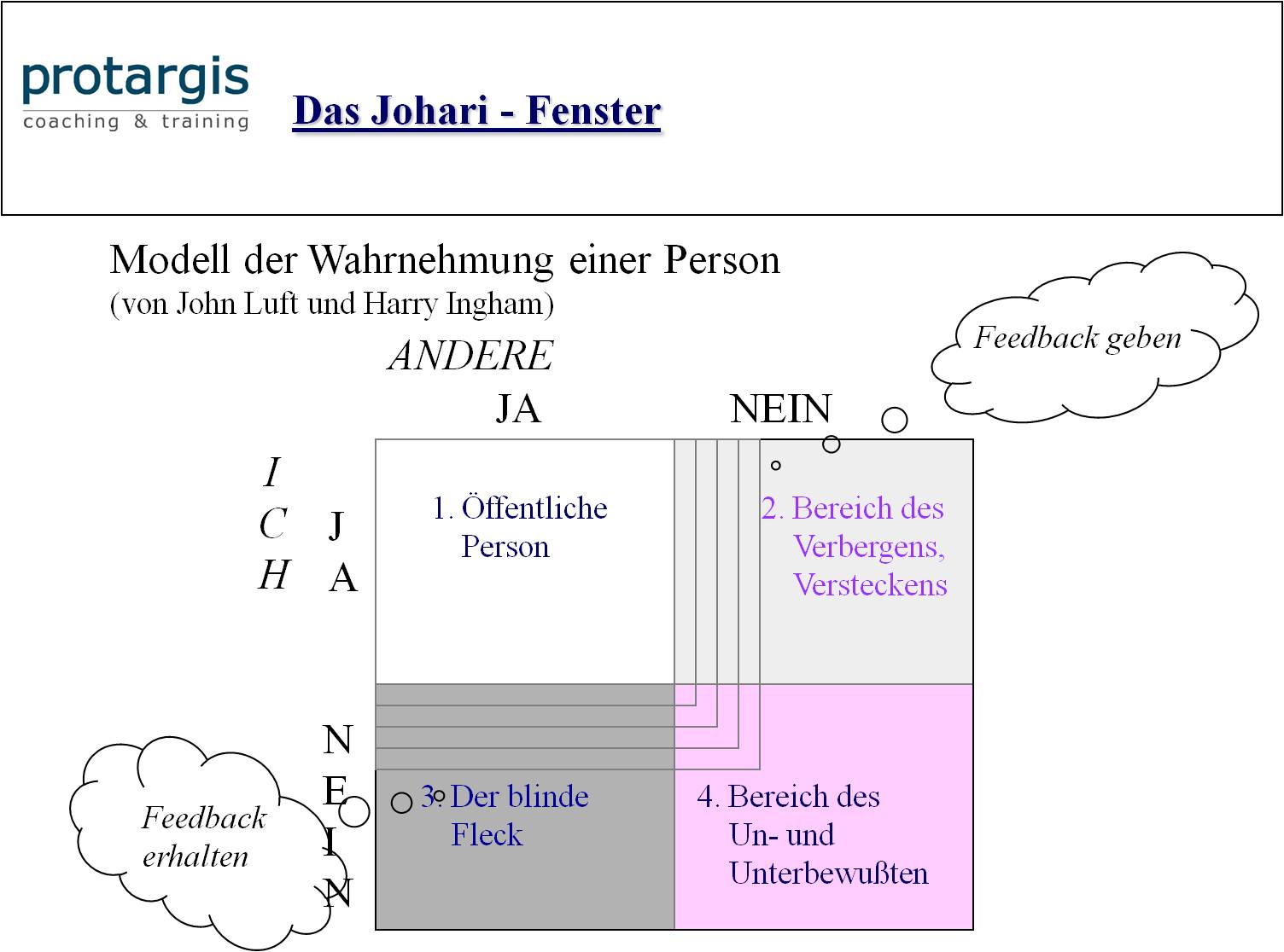 Luft und Ingham unterscheiden die Wahrnehmung einer Person in 4 Kategorien: Was ich über mich weiß oder eben nicht und was andere über mich wissen oder nicht. Johari-Fenster, weil so 4 Bereiche entstehen, die das Modell wie ein Fenster aussehen lassen. Joseph Luft beschrieb als Ziel von Lernen in der Beziehungs- und Gruppendynamik, den gemeinsamen Handlungsspielraum transparenter und weiter zu gestalten. Im Johari-Fenster wird dabei das linke obere Feld der öffentlichen Person immer größer, die anderen drei Felder – Bereich des Verbergens und Versteckens, der blinde Fleck und das Feld des Un- und Unterbewussten – werden zunehmend kleiner.